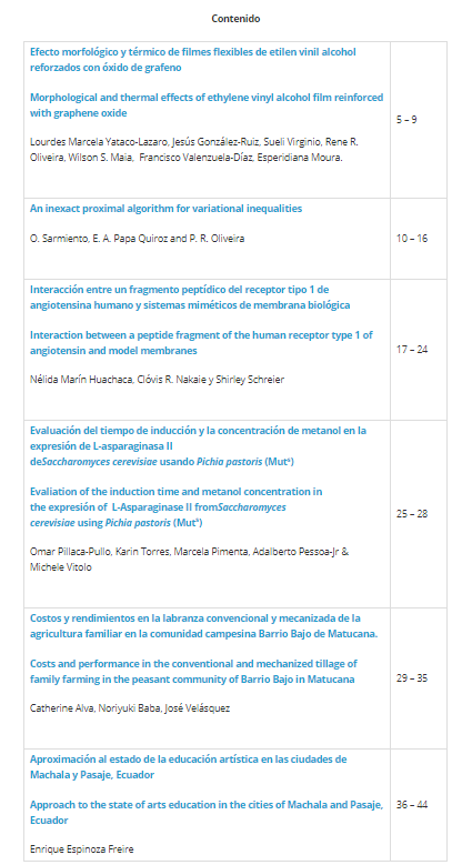 En este volumen encontrara información sobre diferentes topicos como son; Efecto morfológico y térmico de filmes flexibles de etilen vinil alcohol reforzados con óxido de grafeno, An inexact proximal algorithm for variational inequalities, Interacción entre un fragmento peptídico del receptor tipo 1 de angiotensina humano y sistemas miméticos de membrana biológica, entre otros.