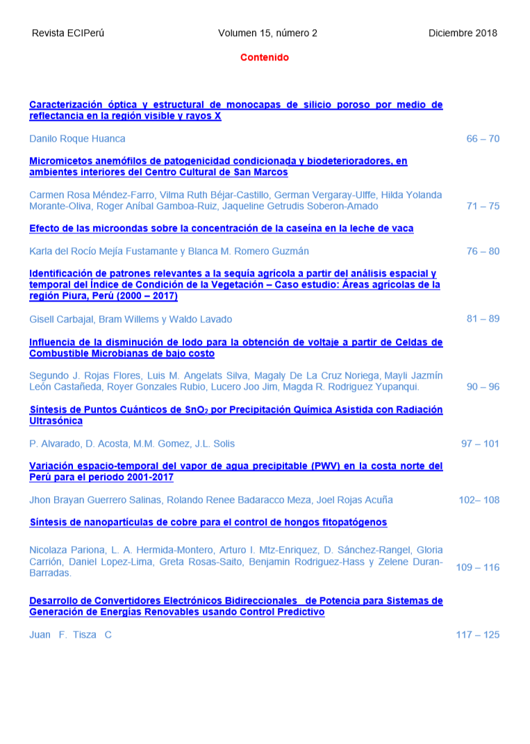 En este volumen encontrara información sobre diferentes topicos como son; Caracterización óptica y estructural de monocapas de silicio poroso por medio de reflectancia en la región visible y rayos X, Micromicetos anemófilos de patogenicidad condicionada y biodeterioradores, en ambientes interiores del Centro Cultural de San Marcos, Efecto de las microondas sobre la concentración de la caseína en la leche de vaca, entre otros.