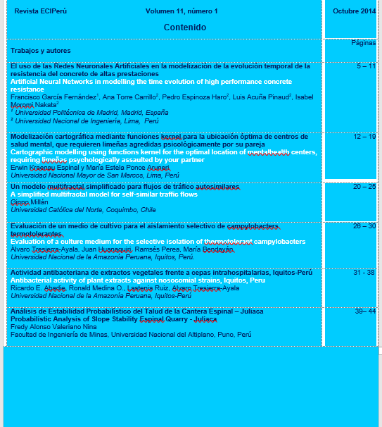 En este volumen encontrara información sobre diferentes topicos como son; el uso de las Redes Neuronales Artificiales en la modelización de la evolución temporal de la resistencia del concreto de altas, prestaciones, modelización cartográfica mediante funciones kernel para la ubicación óptima de centros de salud mental, que requieren limeñas agredidas psicológicamente por su pareja, un modelo multifractal simplificado para flujos de tráfico autosimilares, entre otros